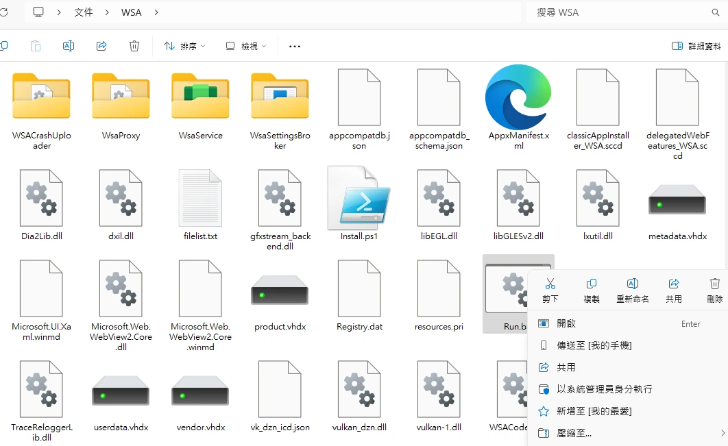 WSA,放到任意路徑,我是放到文件資料夾。這個資料夾不可以刪除。找到資料夾內的
