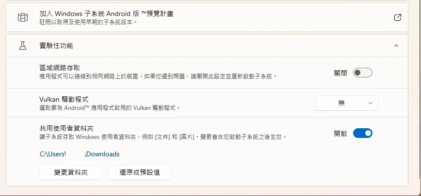 我們可以在WSA控制面板 → 進階設定,勾選共用使用者資料夾,讓Windows與Android共享資料夾。