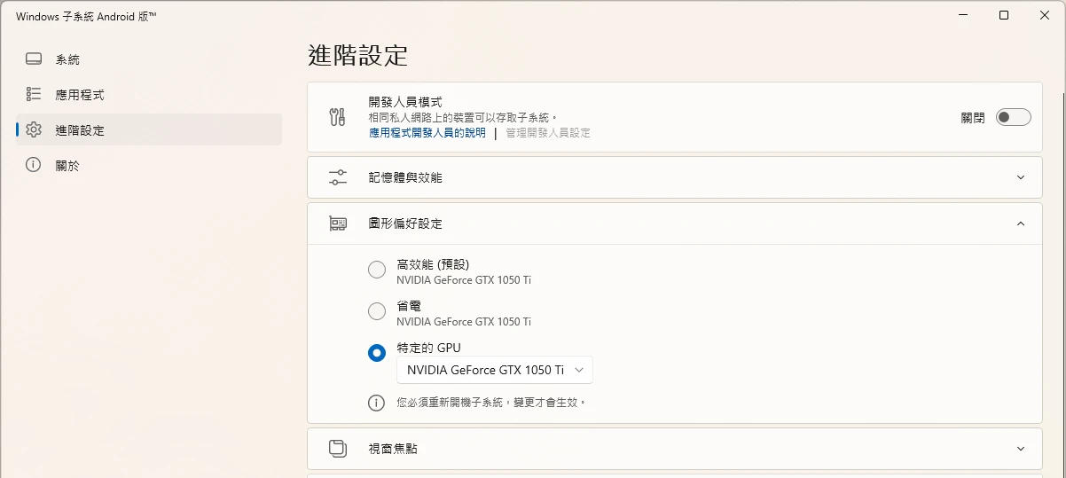 恐怕,WSA只能在Intel或AMD GPU的電腦流暢運作,Nvidia用戶有難了。WSABuilds的Github文件也有提到,Nvidia GPU加速易出問題。