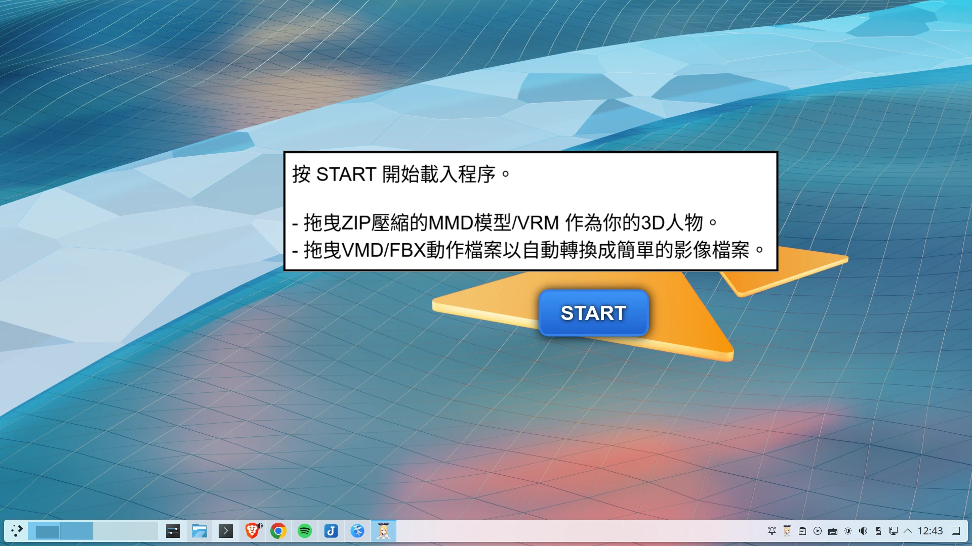 初始啟動的時候,將含有.pmx的.zip檔拖曳進視窗,載入模型。或者直接按Start,載入內建模型。