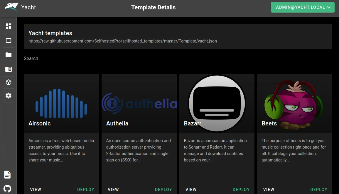 Template頁面即為使用別人寫好的範本,一鍵部署容器服務。Yacht的範本格式與Portainer template v1相容,詳細寫法請看官方文件。