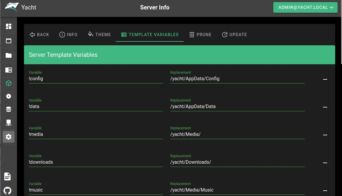 Yacht不支援讀取.env檔案,如果硬要定義環境變數,請參考上節自行撰寫Template,或是在Settings → Template Varaiables先行定義環境變數。