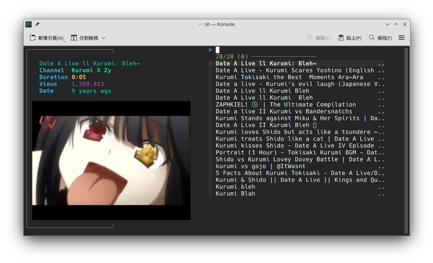 啟動ytfzf,搜尋Youtube影片。啟動時加-s "關鍵字"直接搜尋影片。