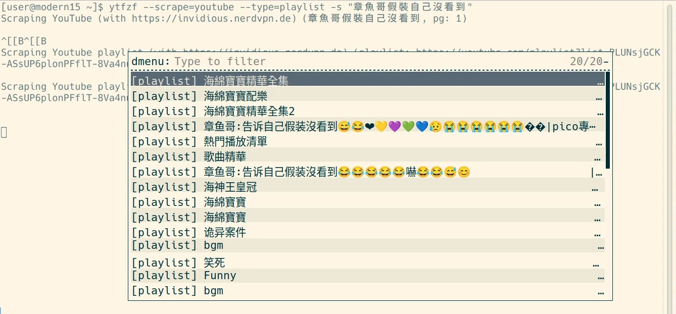 或者用ytfzf --scrape=youtube --type=playlist --force-youtube啟動,搜尋播放清單,進入播放清單界面後,開啟暫存檔/tmp/ytfzf-1000/實例/[playlist]/videos_json,取得目前螢幕顯示的影片列表,將其另存新檔。