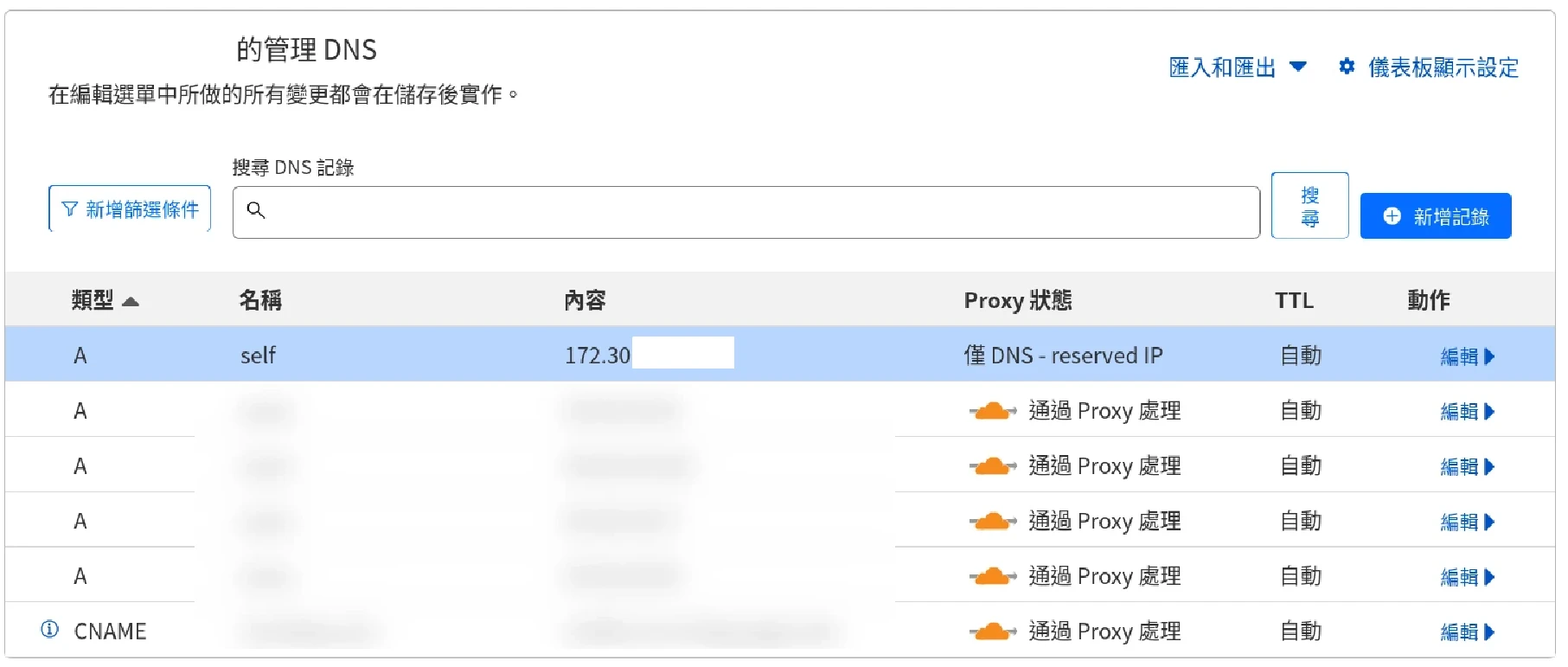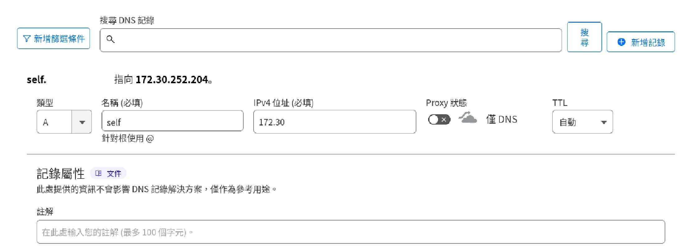 到系統後台,例如我是Cloudflare,新增A Record。這裡的「名稱」是域名的前綴字元,例如